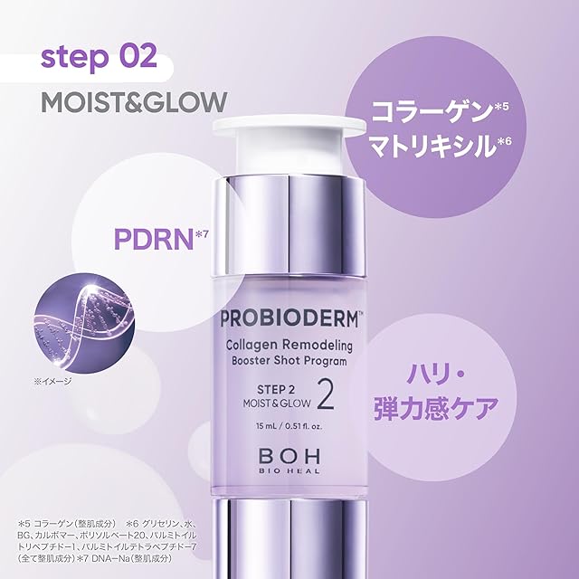 プロバイオダーム コラーゲンリモデリングブースターショットプログラム</br></br> 肌接近に自信を。集中ケア特化型2STEPエッセンス</br></br> #ハリ活乳酸菌*¹</br> #本格ホームケア</br> #ワンショットで狙い撃ち</br> #前向き肌</br></br></br> 1.肌キメ、毛穴*2、ツヤまで狙い撃ちケア</br> 話題の成分を配合した2種類のエッセンスでお肌を整える、本格的なスキンケア。</br> 内側*3からツヤが溢れるような、毛穴*2が目立たないお肌を目指します。</br></br> 2.STEP1 【整える】</br> AHA*4・PHA*5・マイクロニードル*6配合。</br> チクっと届ける*7エッセンスで角質をケアします。</br> さらさらと水のようなテクスチャーがお肌になじみ、STEP2のエッセンスの浸透*7をサポートします。</br></br> 3.STEP2 【満たす】</br> プロバイオダーム*8・コラーゲン*9・PDRN*10+マトリキシル*11配合。</br> とろみのあるエッセンスでお肌のハリツヤをケアします。</br> プロバイオダーム*8とコラーゲン*9だけでなく、PDRN*10とマトリキシル*11も配合することで、ハリツヤケアに徹底的にアプローチ。毛穴*2の目立ちにくい、パンっと輝く肌仕上がりに。</br></br></br> 【このような方におすすめ】</br> うるおい不足による毛穴*2の目立ちでお悩みの方</br> お肌のごわつきが気になる方</br> メイクのりの良いツヤ肌を目指す方</br></br> 【使用方法】 </br> ※ご使用前に、エッセンスのポンプ部分を水滴のマークが目印の位置に来るまで時計回りに回してからご使用ください。</br> ①洗顔後、化粧水でお肌を整えます。</br> ②STEP1のエッセンスを両頬とおでこに塗布し、目の周りを避けてなじませます。</br> ③STEP2のエッセンスを両頬とおでこに塗布し、お顔全体になじませます。</br></br></br> *1 乳酸桿菌発酵液(整肌成分)</br> *2 うるおい不足による</br> *3 角質層</br> *4 クエン酸(整肌成分)</br> *5 グルコノラクトン(整肌成分)</br> *6 加水分解カイメン(整肌成分)</br> *7 角質層まで</br> *8 乳酸桿菌発酵液、フルクトオリゴ糖、フルクタン、イヌリン、パンテノール、ベタイン、β一グルカン(全て整肌成分)</br> *9 コラーゲン(整肌成分)</br> *10 DNA-Na(整肌成分)</br> *11 グリセリン、水、BG、カルボマー、ポリソルベート20、パルミトイルトリペプチド-1、パルミトイルテトラペプチド-7(全て整肌成分)</br> *12 加水分解カイメン(整肌成分)</br></br></br> [内容量] STEP1・2ともに15mL</br> [使用時の注意事項]</br> 1.お肌に異常が生じていないかよく注意して使用してください。化粧品がお肌に合わないとき即ち次のような場合には、使用を中止してください。そのまま化粧品類の使用を続けますと、症状を悪化させることがありますので、皮膚科専門医等にご相談されることをおすすめします。(1)使用中、赤味、はれ、かゆみ、刺激、色抜け(白斑等)や黒ずみ等の異常があらわれた場合(2)使用したお肌に、直射日光があたって上記のような異常があらわれた場合</br> 2.傷やはれもの、しっしん等、異常のある部位にはお使いにならないでください。</br> 3.唇に異常があらわれたときは、ご使用をおやめください。</br> 4.保管及び取り扱い上の注意事項1)乳幼児の手の届かないところに保管してください。2)極端に高温又は低温の場所、直射日光のあたる場所には保管しないでください。</br> [製造国]大韓民国</br> [製造販売元]CJ Olive Young Japan株式会社</br></br>