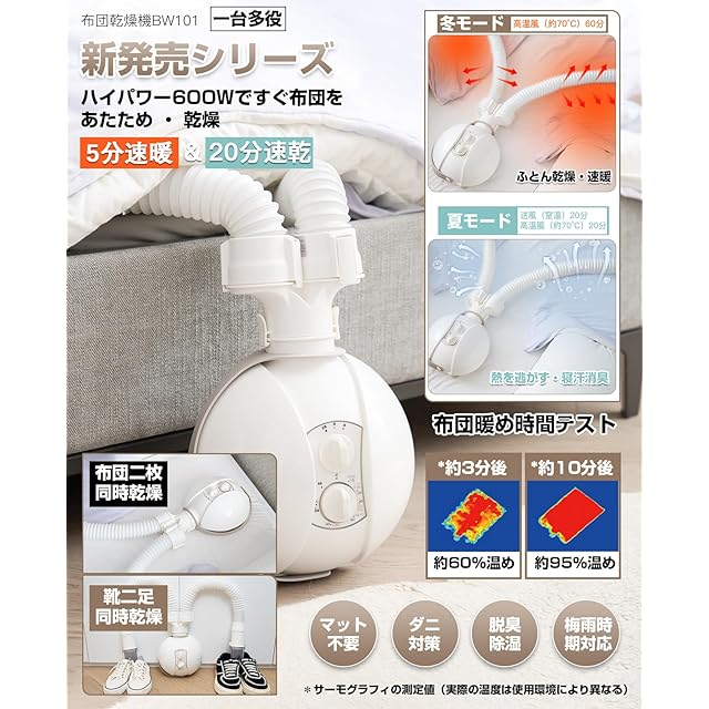 【5分速暖&20分速乾・1台多役&一年中活躍・マット不要】:600Wのハイパワーふとん乾燥機で、布団を温め、素早く乾燥させることができます。布団のほか、衣類乾燥、くつ乾燥、押し入れ乾燥、ダニ退治、ペット乾燥、足元に置いてヒーターとしても使えます。春は花粉対策(室内干し)、夏は梅雨や台風の湿気対策、秋は衣類乾燥とダニ退治、冬は寒さと湿気対策と、1年中オールシーズン簡単に対応できます。ホースを伸ばして布団をかけるだけで運転でき、マットは不要です。