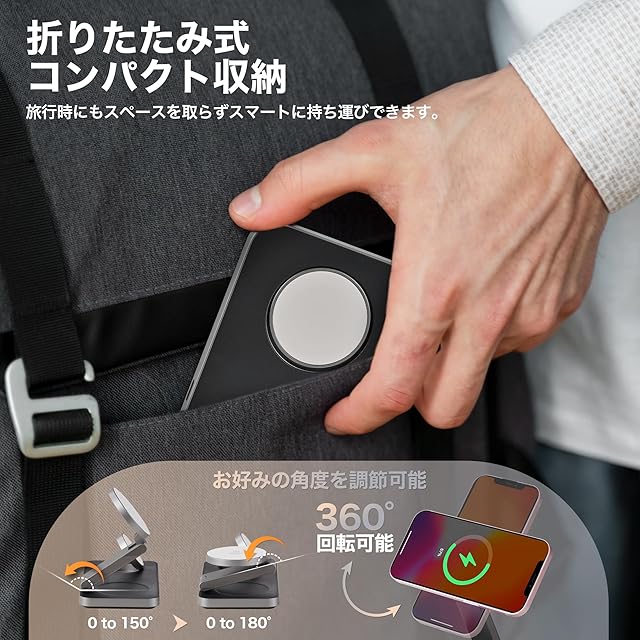 【持ち運び便利 & 角度調節可能】折りたたみ式デザインでコンパクト収納。旅行時にもスペースを取らず、スマートに持ち運びできます。横向きでも縦向きてもご利用可能、お好きな角度で充電しながらスマホ操作ができます。