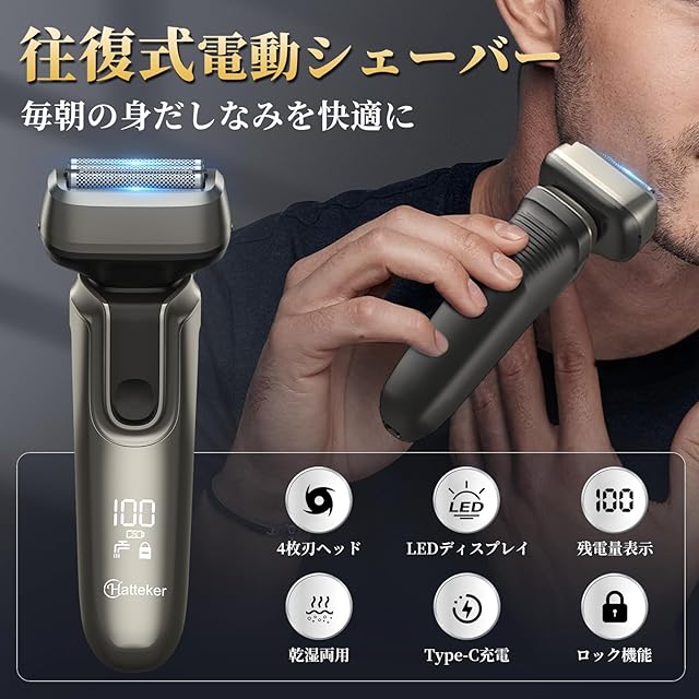 【革新的な4枚刃・忙しい朝も、素早く剃り残しゼロへ】上下左右に独立して動く4枚のフローティングヘッドが肌にぴったり密着し、顎や鼻下など顔の複雑な曲線を効率よく深剃りし、従来の3枚刃のシェーバーと比較して効率がUP!さらに、自動研磨システムが搭載され、毎回鋭い切れ味を保ち、肌への負担も抑えます。高品質ステンレス鋼製刃も採用され、耐久性に優れています。 【パワフルなモーター・毛を引っ張ることが心配なし】電気シェーバーは、10000rpmリニアモーターを内蔵しており、強力な回転力でひげを剃り上げます。カールしていたり寝ていたりするひげも逃さずにスッキリと深剃りし、顔をツルツルに仕上げます。忙しい時でも一気にひげを素早くきれいに整理できます。AI 技術を搭載しており、ひげの濃密さと硬さを自動的に感知して出力を調整します。 【乾湿両用・お手入れ簡単】ウェット剃りとドライ剃りの両方に対応した乾湿両用設計で、シェービングフォームやジェルを使った肌にやさしい剃り方にも対応します。シャワーと一緒にシェーブできるので、いっそう肌に優しくシェービングでき、時間を短縮します。きれいにする時は、まずブラシできれいにしてから、ヘッド部分を水で洗って、もっときれいにすることができます。 【LEDディスプレイ・一目で状態を確認】電動シェーバーの視認性抜群の液晶ディスプレイを搭載し、バッテリー残量・充電中・水洗いリマインダーを一目で確認できます。これにより、充電のタイミングを把握し、使用が中断しないようにできます。また、電源ボタンを3秒長押しするとロック状態になり、突然の起動や外出時の誤操作を防ぐだけでなく、お子様の誤操作も防止します。 【Type-C急速充電・5分クイックチャージ】大容量バッテリーを内蔵し、フル充電で60分間の連続使用が可能で、毎日2分使用なら約30日間利用できます。国際標準インタフェース付きUSB充電線は、PC、モバイル電源や車載USBポートから充電することもでき、アダプター(5 V/1 A)を接続して自宅のコンセントで充電することもでき、出張、旅行、オフィスでも電力がなくなる心配はありません。
