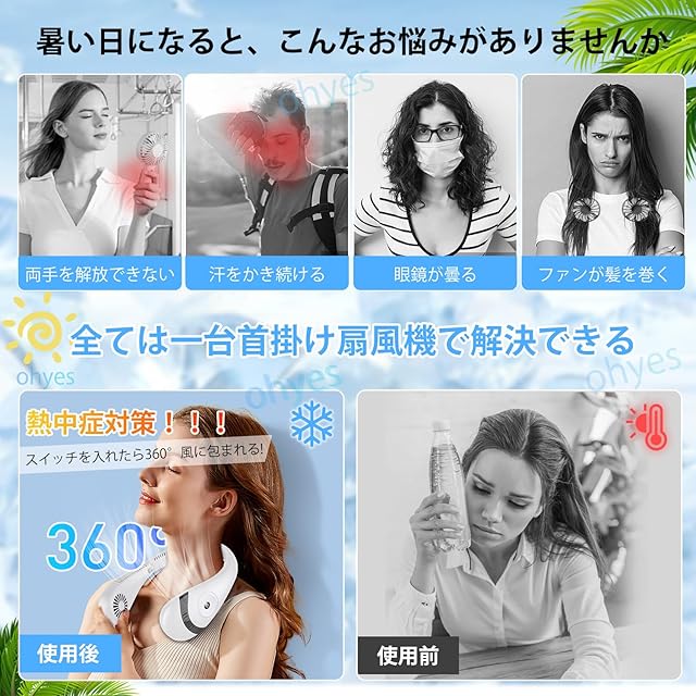 【2025最新進化・羽根なし首掛け扇風機&急速冷却】ohyesの最新バージョンの折りたたみ式ネッククーラーは、空気流とノイズ低減機能をアップグレードしています。この首掛け扇風機は、より強力な気流と低騒音を備えており、常に冷却を維持しています。独立風カバー技術と二重タービン扇葉設計を採用し、寿命が長く、風速を高めた。従来の首掛けファンよりも安全で、髪が挟まれたりほこりが出たり、汗が首掛け扇風機に入ったりする心配がありません。暑い夏に仕事仲間としての理想的な選択。購入前に注意してください:私たちのファンの首の後ろには風がありません。ファンの電源スイッチを押しても反応しない場合は、まず充電してから使用してください。