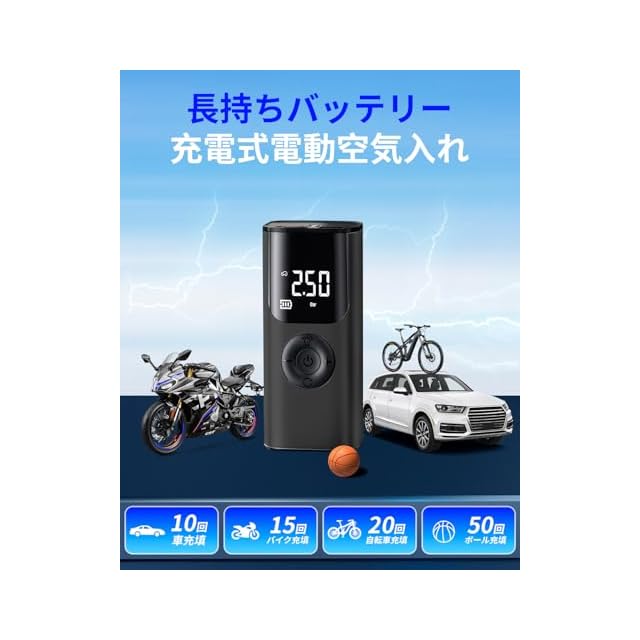 商品名:自転車 空気入れ 電動【2025年新設計】電動空気入れ 充電式 コードレス バイク LED懐中電灯 空気圧指定可 自動停止 最大圧力150PSI 多機能 エアポンプ 大容量バッテリー 仏/英/米式バルブ対応 急速充電 モバイルコンプレッサー コンパクト 自動車/自転車/ボール/浮き輪/バイク対応 小型 軽量 携帯電動ポンプ 日本語説明書付き