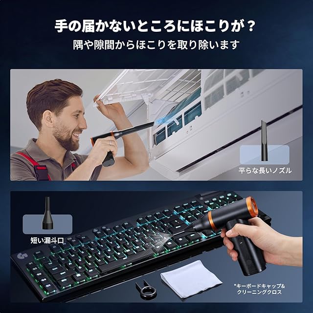 吸引と吹き出しを1台に集約した革新的な設計。強力なエアダスターでホコリや汚れを素早く吹き飛ばし、効率的な清掃を実現します。また、吸引機能も搭載しており、必要に応じてゴミを簡単に回収できます。自宅や車内、精密機器などの場面で活躍する便利な一台です。