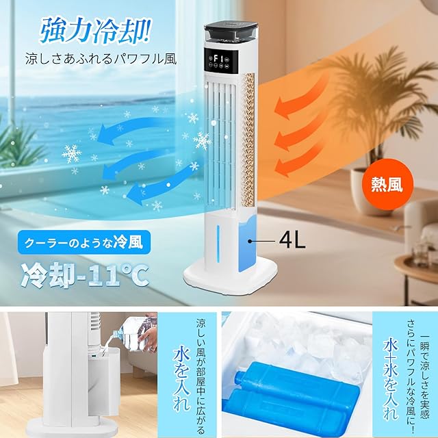 Saluyar【2025年新型】冷風機 加湿器 1台2役 95cm高さ タワーファン 扇風機 冷風扇 強力送風 冷風扇風機 静音 自動首振り 3段階風量調整 スポットクーラー 省エネ 24Hタイマー ムードライト 冷風モード 保冷パック*4 家庭用 リビング ポータブルクーラー れいふうき 熱中症対策 PSE承認済 白い