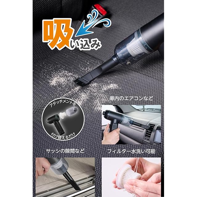 アタッチメントを付け換えるだけで、ハンディ掃除機としても使える2WAY仕様です。車内のエアコンなどの掃除にも便利です。