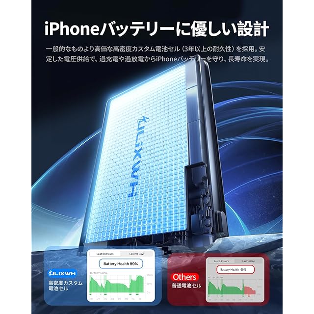 【iPhoneバッテリーに優しい設計】一般的なものより高価な高密度カスタム電池セル(3年以上の耐久性)、三元系材料(NCM:ニッケル·コバルト·マンガン)を採用します。安定した電圧供給で、過充電や過放電からiPhoneバッテリーを守り、長寿命を実現します。iPhoneバッテリーに優しい設計です。