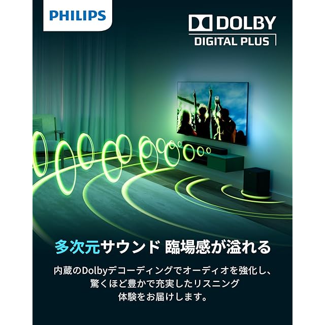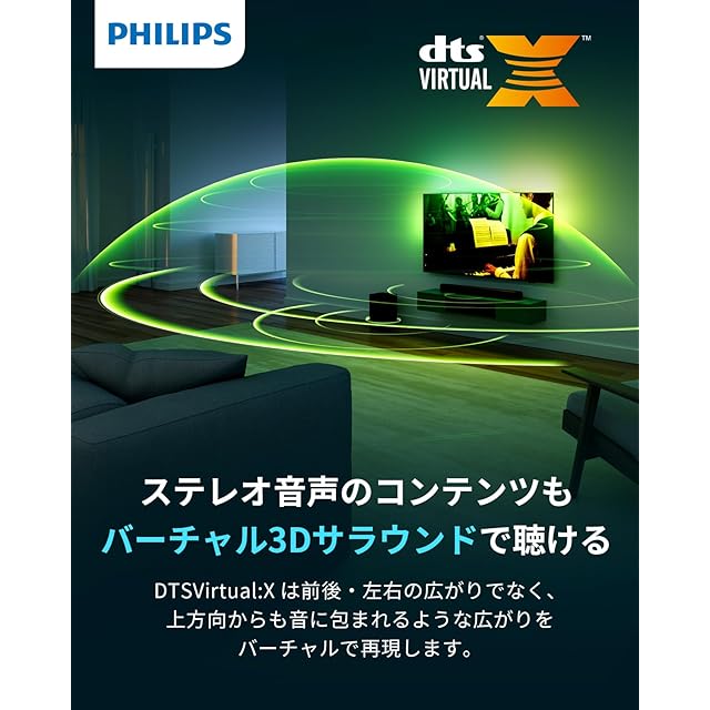 【映画館のような没入型サウンド】:PHILIPS サウンドバーは2つのユニットを内蔵で、バイネルスピーカーはステレオ効果を生み出し、空間に音楽のサラウンド分布を感じることができます。音楽をよりダイナミックに、思いのままに楽しむことができます。DTS Virtual:Xは広い3Dサラウンドサウンドを創造し、前面、左側、右側とサラウンドサウンドに高さを加え、より広く、より高く、より没入的なサウンド体験をお楽しみいただけます。雨や落雷、空中を旋回するヘリコプターなど頭上からのサウンドも的確に再現することで、アクション映画の視聴やテレビゲームのプレイに圧倒的な臨場感を与えます。