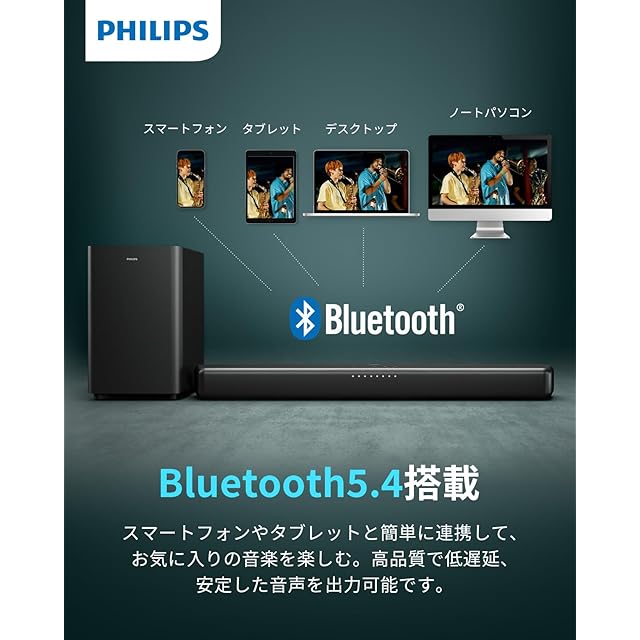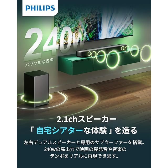 商品名:Philips(フィリップス) サウンドバー テレビ用 Bluetooth5.4搭載 スピーカー 240Wハイパワー Soundbar Dolby Digital plus DTS Virtual:X 立体音響技術 ワイヤレスサブウーファー付き リモコン付属 PC対応 ゲーム スピーカー テレビ/パソコン/スマホ HDMI TAB5309 (サブウーファー付き)