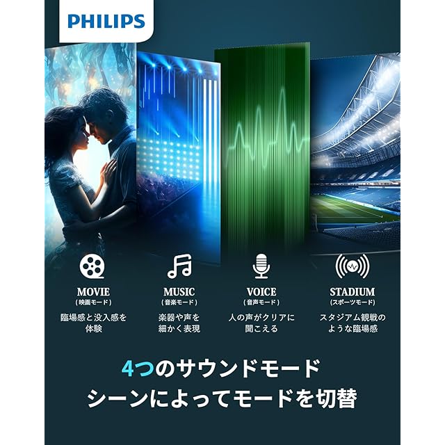 【シーン別のサウンドモード】:PHILIPS テレビスピーカーはDSP(デジタル・シグナル・プロセッサー)搭載して、ムービーモード、音楽モード、スタジアムモード、音声モードの4種類のサウンドモードから選択できます。ムービーモードでは力強い低音とバーチャルサラウンドサウンドにより、映画館にいるような臨場感を提供します。音楽モードではクリアでバランスの取れた高音、中音と深い低音を実現します。ニュースモードでは、会話を聞きやすくするために中音域が強化され、その他の音によって会話がかき消されません。