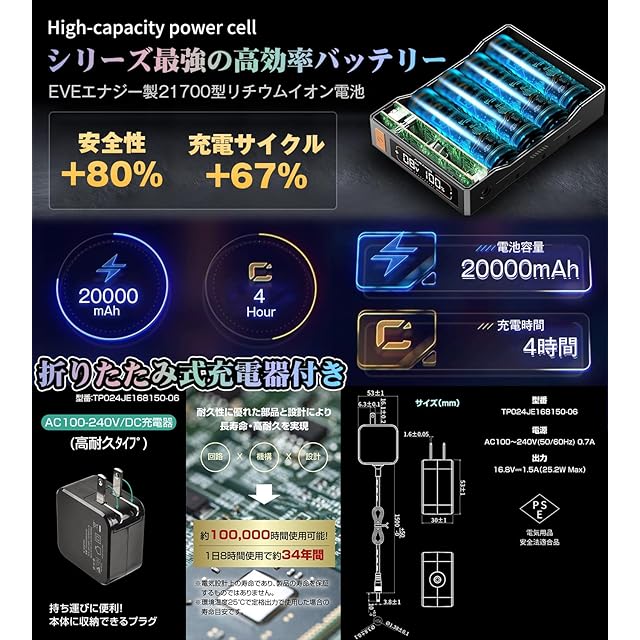 【高い安全性を実現】本製品にはEVEエナジー製の電池セルを採用しており、安全性は業界最高水準に達しています。EVEエナジーはドイツBMWの電池セル供給メーカーの一つです。一般的なリチウムイオン電池は、損傷時に発火のリスクがあります。しかし、EVEエナジー製の電池は、電池内部で発熱が発生しても、熱暴走や発火のリスクを大幅に低減する安全設計となっています。※EVEエナジーは、世界の動力電池搭載量で第4位にランクインしている上場企業です。