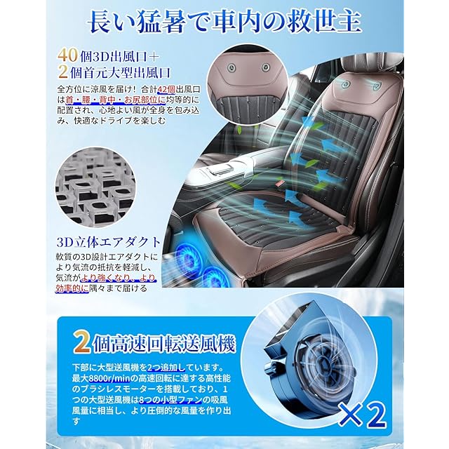 商品名:シートクーラー 車 クールシート 【2025年 2個大型送風機 無段階風量調整 DC12V/24V対応】 首元/背中/座面 42個通気孔 3Dメッシュ 冷風送風 低作業音 涼しい 蒸れない 通気性 快適ドライブ 滑り止め 取り付け簡単 熱中症対策 長距離運転 (ブラウン)