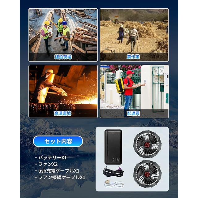 ♀【1年·連絡について】ご購入日から一年間付き、その間に万が一製品に関する問題があったら、お気軽に下記の連絡方法でご連絡ください。誠心誠意迅速にご対応させて頂きます。【連絡方法】:1.注文履歴から該当する注文の「注文に関する問題」を選択します。2.ご自身の直面している問題に近いものを一覧から選択します。3.「出品者に問い合わせる」を選択します。4.理由を選択し、テキストポックスにコメントを入力します。5.「送信」を選択します。▶【パッケージ内容】21Vバッテリー*1、ファン*2、フアン接続ケーブル*1、充電ケーブル*1、取扱説明書*1。