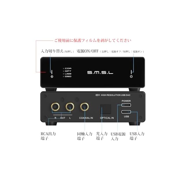 商品名:S.M.S.L D1 D/Aコンバーター ハイレゾ対応/ROHM 高性能DAC IC 「BD34352EKV」搭載/USB 光ファイバ 同軸 から RCA 変換 OTG オーディオ Mini USB DAC