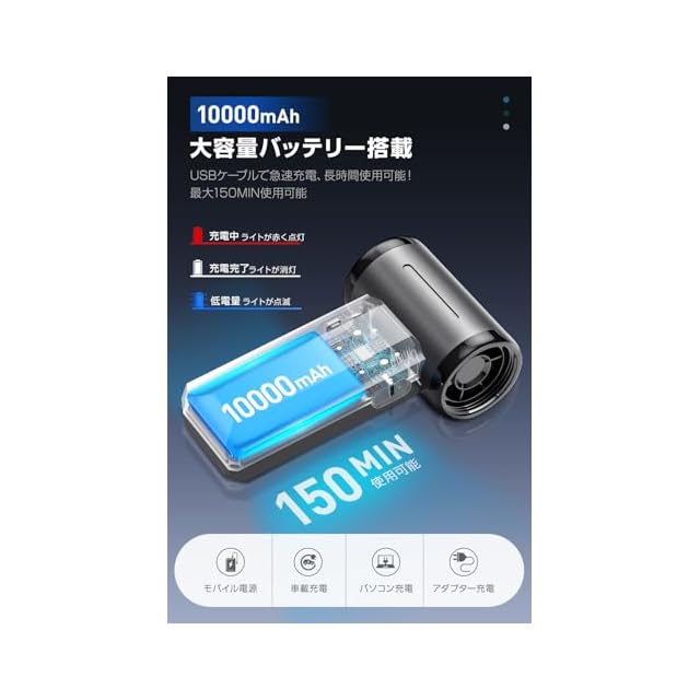 ✨③【大容量バッテリー搭載で長時間使用OK 洗車 ブロワー 最強】USB Type-Cでサクッと充電、10000mAhの大容量バッテリーで最長150分の連続使用が可能。LEDランプでバッテリー残量も一目瞭然。赤く点灯で充電中、消灯で満充電、点滅は残量が少ないサイン。コードレス&長時間駆動だから、洗車やアウトドアでも使いやすく、ブロワー 洗車用としても重宝される1台です。