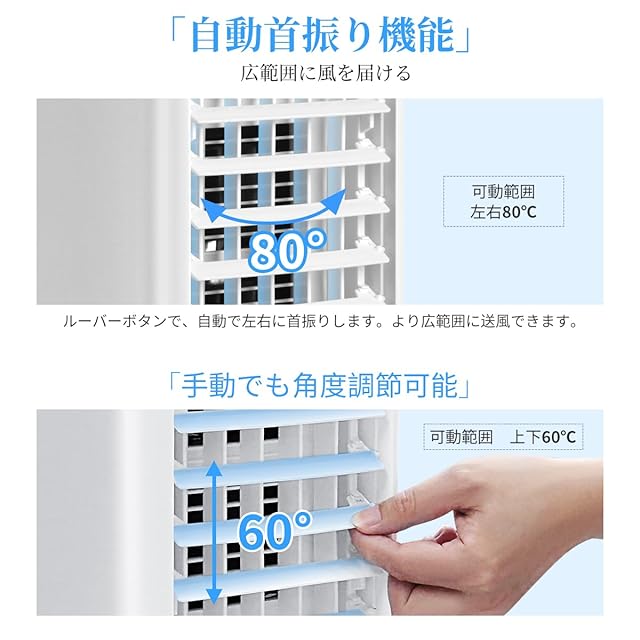 「自動首振り・静音冷風機」この冷風扇は広範囲に涼風を届ける自動首振り機能搭載の静音設計冷風機。左右80°の自動首振りと上下60°の手動ルーバー調整を組み合わせることで、冷気を効率的に循環させ、オフィスやご家庭に快適な空間を創出します。超静音設計により、読書や瞑想、昼寝時にも邪魔にならない、そよ風のような自然な涼しさを提供。心と体に優しい、健康配慮型のスポットクーラーです。