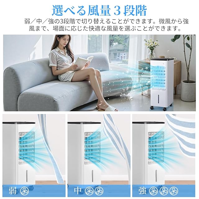 「3段階風量・シーンによって選べる風量」3段階調節可能な風量で、シーンに合わせた最適な涼しさを提供。強・中・弱の切り替えが簡単で、猛暑日でも微風から強風までお好みに応じて調節可能。従来の扇風機よりも涼しく、エアコンよりも省エネなのが特長です。タッチパネル式でワンタッチ操作、清潔で爽やかな冷風がすぐにお届け。静音設計で就寝時も快やか、お子様からご年配の方まで安心してお使いいただけます。