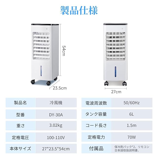 気化式冷風機は送り出す空気を気化熱の作用によって冷やす扇風機です。 特徴:冷風機 冷風扇 冷風扇風機、保冷パック2個付き、6L水タンク、 3段階風量、自動首振り、上から給水、取っ手付・キャスター付移動しやすい、リモコン付遠距離操作可