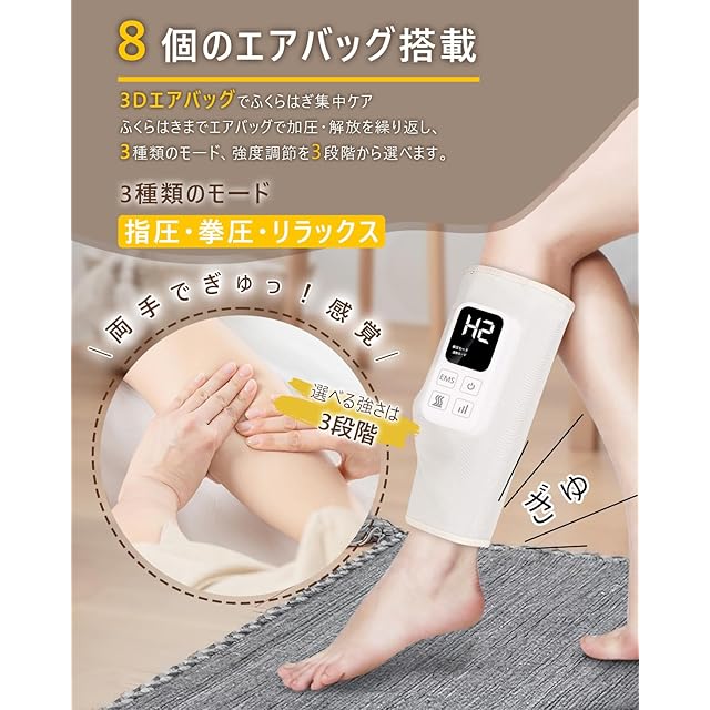 【3つのモード×3段階の強さ設定】空気圧式のエアバッグがふくらはぎ全体を優しく包み込み、加圧・解放を繰り返します。指圧・拳圧・リラックスの3モードを搭載。さらに、それぞれのモードに3段階の強さ設定が可能で、自分好みの心地よさを追求できます。