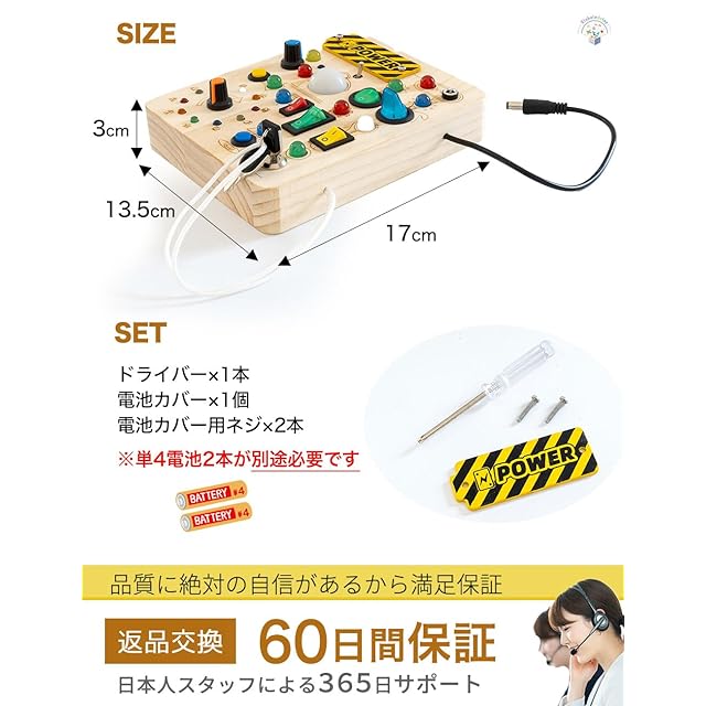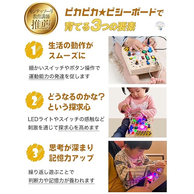 商品名:【知育のプロ推薦】モンテッソーリ ピカピカ★ビジーボード 知育玩具 おもちゃ【23種類のLEDライト】【食品衛生法試験合格】【二重検品安全設計】1歳 2歳 3歳 誕生日 プレゼント 木製感覚 指先知育 早期開発 幼児 男の子 女の子 ドライバー付き【日本正規品】