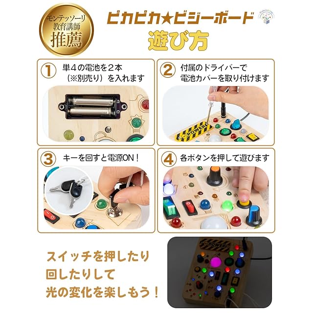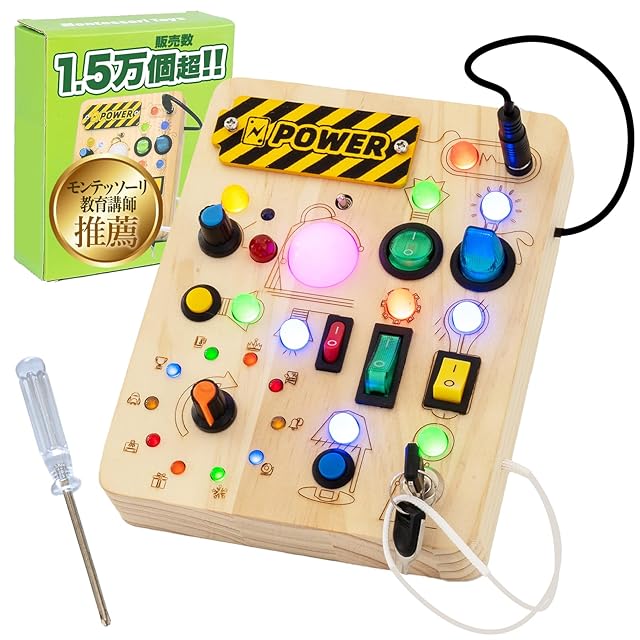 【知育のプロ推薦】モンテッソーリ ピカピカ★ビジーボード 知育玩具 おもちゃ【23種類のLEDライト】【食品衛生法試験合格】【二重検品安全設計】1歳 2歳 3歳 誕生日 プレゼント 木製感覚 指先知育 早期開発 幼児 男の子 女の子 ドライバー付き【日本正規品】