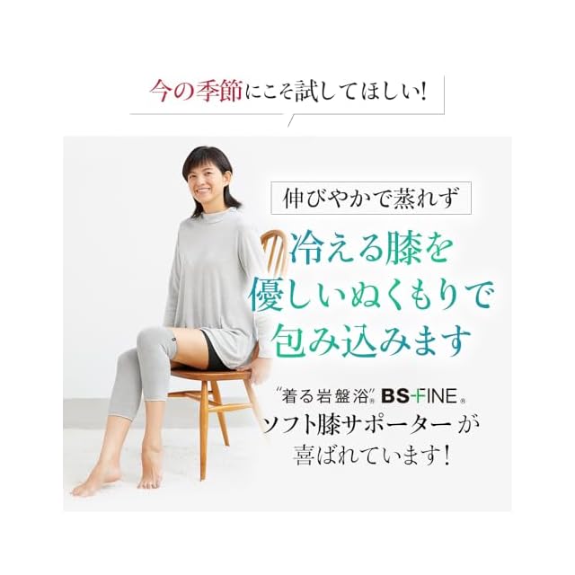BSファインソフト膝サポーターは伸びやかで蒸れない。なので一年中快適にご愛用いただけます。1枚着けるだけで冷える膝を優しいぬくもりで包み込みます。