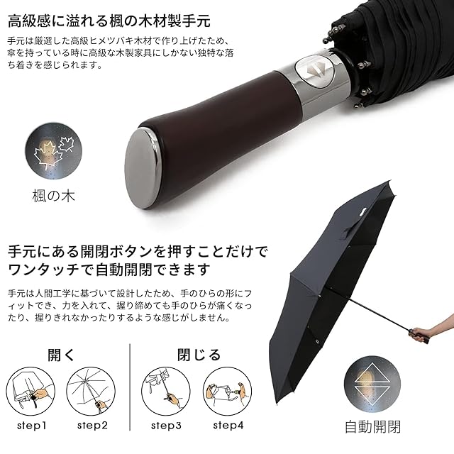 <b>折りたたみ傘 自動開閉 大きい メンズ 耐風</b> 1:折りたたみ傘はビッグサイズ設計で、快適に雨を防ぎます。 <br> 2:折りたたみ傘は超撥水素材を採用し、雨をしっかり弾きます。 <br> 3:折りたたみ傘は高強靭な傘骨を使用し、安定した使用が可能です。 <br> 4:折りたたみ傘は細部までこだわったデザインで、安全性と使いやすさを兼ね備えています。 <br> 5:折りたたみ傘は高級木製の上質なデザインで、洗練された印象を与えます。 <br> ● 140cm 折りたたみ傘はアーチ幅140cm、直径123cmのビッグサイズ設計で、大人2人が余裕をもって入れる広さを確保。折り畳み傘 自動開閉機能により広範囲をカバーし、斜めからの雨もしっかり防ぎます。 <br> ● 折り畳み傘 自動開閉機能を搭載し、片手で簡単に開閉可能。車やバスの乗り降り時や、荷物を持ったままの使用でもスムーズに扱えます。 <br> ● 折りたたみ傘 大きいサイズで、防水性の高い生地を採用し、優れた撥水性能を発揮。雨水が付着しても軽く振るだけでサッと払え、持ち運び時も快適です。 <br> ● 140cm 折りたたみ傘はカーボンファイバー製の8本骨構造を採用し、強風や豪雨でも折れにくく、高い耐久性を実現。長期間安心して使用できます。 <br> ● 折りたたみ傘 メンズ向けの深みのある木製の傘頭が上品な印象を演出。シンプルながら洗練されたデザインで、雨の日も優雅に過ごせます。 <br>