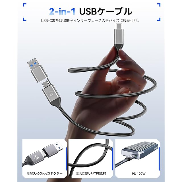 【パッケージ】ドライブ不要、差し込んですぐ使用可能。1xケース本体、1xのType C to C/A 2合一データケーブル、1x熱伝導ゴム、1xねじ回し、1x説明書。弊社は12ヶ月の期限があります。本品を使用している際に何の問題があれば、ご遠慮なく弊社に連絡してください