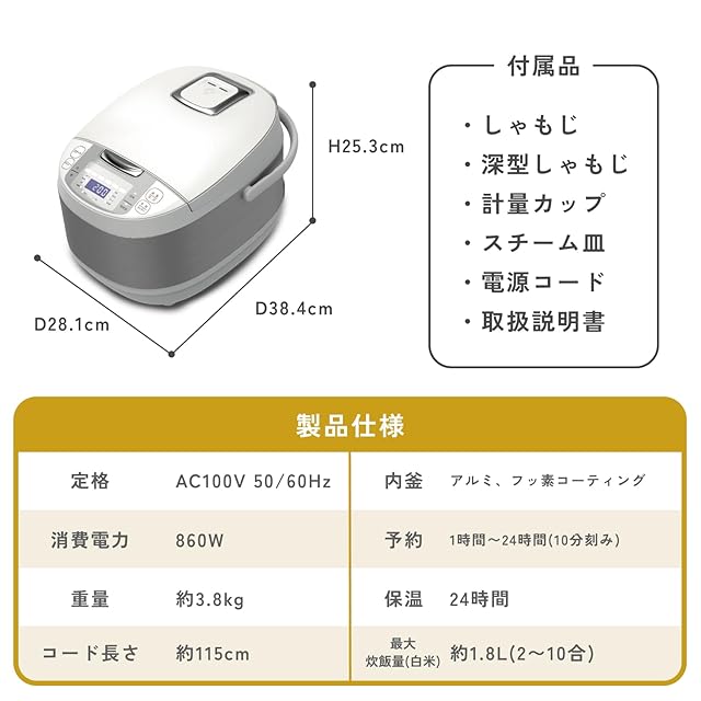 【製品仕様】サイズ:約幅281×高さ253×奥行384mm、重量:約3.8kg、コード長さ:約115cm、定格:AC100V 50/60Hz、消費電力:860W、最大炊飯量(白米):1.8L(10合)、タイプ:マイコン式、メニュー:白米、早炊き、無洗米、玄米、スチーム、おかゆ、炊き込みご飯、雑穀米、再加熱、予約:1時間~24時間(10分刻み)、保温:24時間、付属品:しゃもじ、深型しゃもじ、計量カップ、電源コード、スチーム皿、取扱説明書兼書