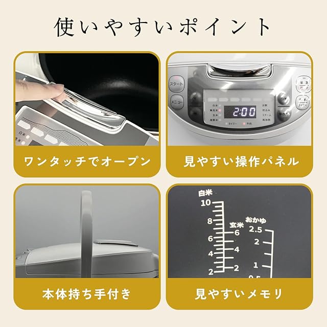 【9つのメニュー】白米、早炊き、無洗米、玄米、スチーム、おかゆ、炊き込みご飯、雑穀米、再加熱からモードが選べていろんな調理が可能。