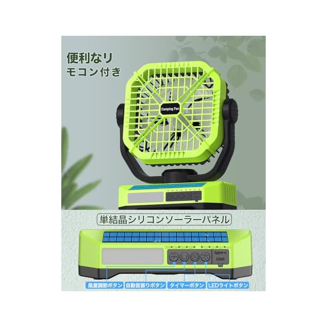 商品名:CEDIO キャンプ扇風機 卓上扇風機 車中泊 20000mAh大容量 最大150時間連続使用 太陽光パネル 吊り下げ タイマー 自動首振り 単結晶シリコンソーラーパネル 風量4段階調節 LEDライト搭載 扇風機 停電 防災グッズ 災害対策 キャンプ用品 テントマット コンパクト 持ち運び便利 リモコン付き