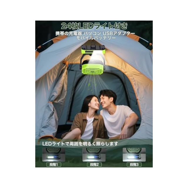 【20000mAh大容量・200時間持続するLEDライト】キャンプ 扇風機は20000mAhの超大容量リチウムイオンポリマー電池を内蔵しています。フル充電の場合、扇風機で最大60時間、LEDライトで最大100時間の航続が可能です。16個のLEDライトで周囲を明るく照らします。キャンプ 扇風機は暗闇の中ランタン代わりに使える3段階切り替えLEDを完備しています。シーンに合わせた明るさ設定が可能です。