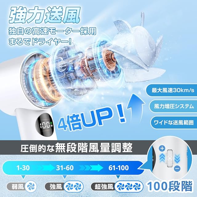 【超強風×静音×冷却の進化系】夏の定番として ハンディファン がさらに進化!本 ハンディファン は、 ハンディファン 冷却プレート を搭載し、ただの 手持ち扇風機 では得られないひんやり体験を実現できる ハンド扇風機 。 ハンディ扇風機 の常識を超える、最大-17℃の冷却力を誇ります。 ハンディファン ならではの持ち運びやすさと、 手持ち扇風機 としての使いやすさを両立。風量は1〜100段階の無段階調節に対応できる ハンディ扇風機 としての風力だけでなく、 ハンディファン 冷却プレート の恩恵で、風+冷却のダブル効果を実感。 ハンディファン は 暑さ対策 に欠かせないこの ミニ扇風機 がとても魅力です。夏本番、手放せないのはやっぱり ハンディファン 。一家に一台は欲しい、実力派 ハンディ扇風機 で、猛暑を快適に乗り越えましょう。進化した 手持ち扇風機 が、あなたの夏を変えます。⁂この 携帯扇風機 は、冷却モードで最大50段階まで調整可能です。ご了承ください。