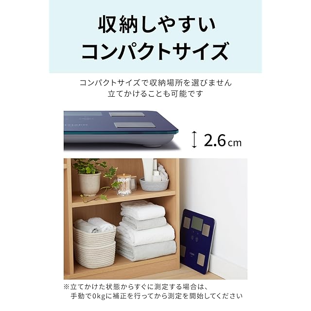【場所を取らない薄さ26mmのスリムデザイン】本体の厚さ26mmは500円玉の直径とほぼ同じ。強固ガラスで135kgまで測定可能です。立てかけ収納で出し入れもラクにできます。