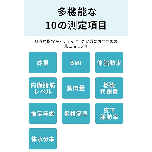 【多機能な10の測定項目】体重 体脂肪率 BMI 内臓脂肪レベル 筋肉量 基礎代謝量 推定年齢 骨格筋率 皮下脂肪率 体水分率