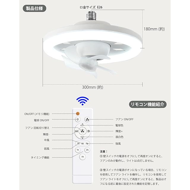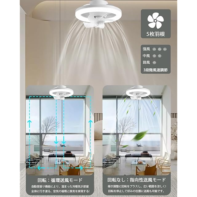 商品名:シーリングファンライト 天井ライト 扇風機 360°回転 無階段調光/調色/風量3階段調整 タイマー機能 ファン13.5W LED60W 10畳 2500lm E26口金 リモコン付き 工事不要 簡単取り付け 省エネ ホワイト