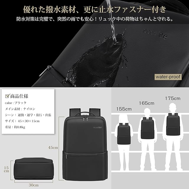 商品名:[ecoofee] ビジネスリュックメンズ リュック 防水 止水ファスナー 軽量 撥水加工 ビジネスバッグ 大容量 15.6インチPC 通勤 バックパック 出張 旅行 リュックサック ギフト プレゼント