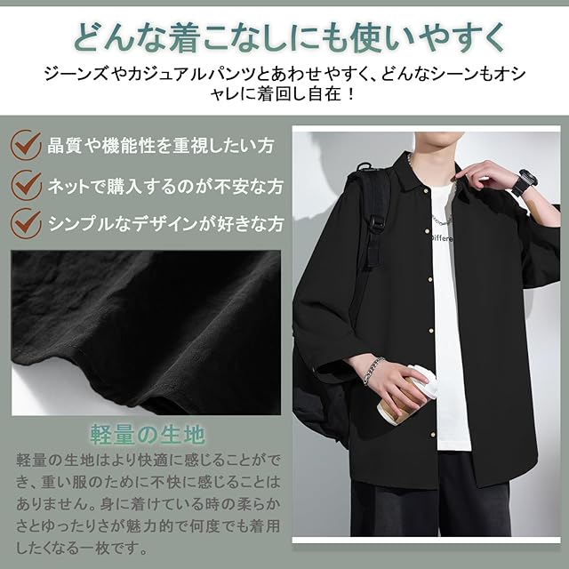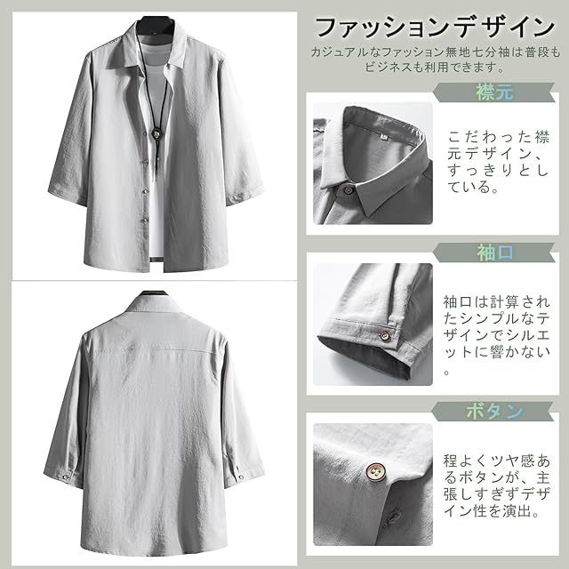 【ファッションデザイン】カジュアルなファッション無地七分袖は普段もビジネスも利用できます。身体のラインを拾わないゆとりのある身幅、華奢見せつくるドロップショルダー。リラックスしながらトレンド感のあるおしゃれな着こなしが実現します。素材の良さ、飽きない無地デザインと、シャツ本来の着心地と楽しさが味わえます。夏で頼りになる涼しいシャツです。