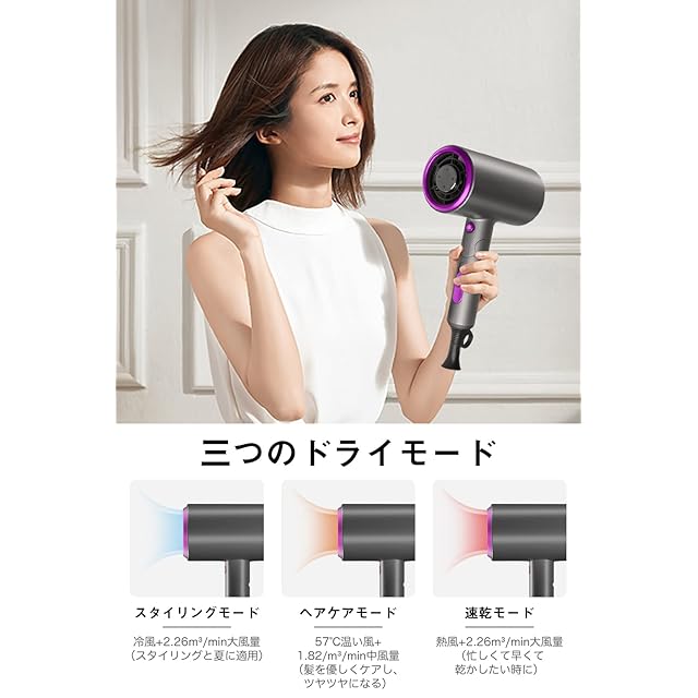 【3段階風温自由調節】3つの風温モードがあります。髪を素早く乾かすか、スタイリングするか、髪の状態やニーズに応じて自由に選択できます。子供たちでも安心して使用できる設計です。このドライヤーは、どんな髪質やスタイルにも自由自在に対応し、自信を持って外出できるようサポートします。