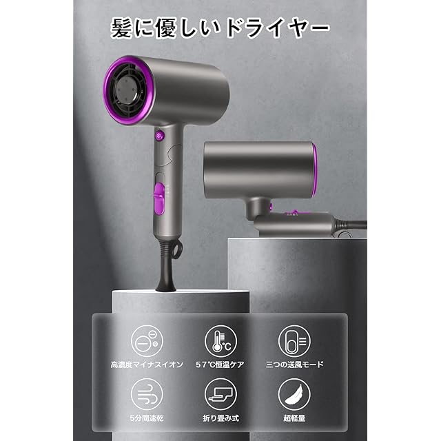 商品名:ドライヤー 大風量 【2025最新型】速乾 軽量 折り畳み式 高濃度マイナスイオン 恒温ヘアケア 冷熱風 3段階風量調節 ノズル付き コンパクト 持ち運び便利 家庭用/寮用/旅行用 どらいやー ヘアドライヤー PSE認証済み