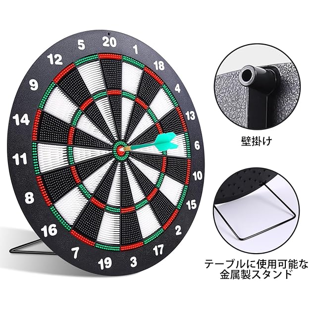 【2つの取り付け方法】ダーツ盤は卓上ゲーム用の金属スタンドと、壁掛け用の補強釘穴が内蔵されており、テーブル、壁、ドアなど、どこにでも設置できます。