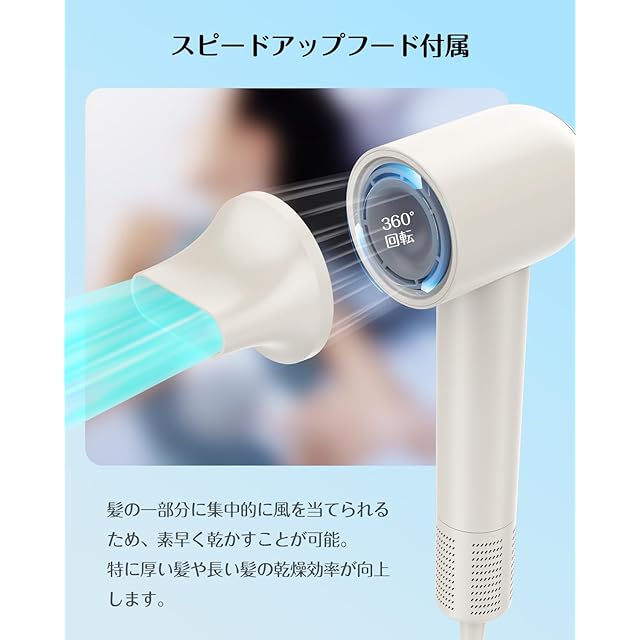 【360°ノズル&着脱可能カバー】 ドライヤーは集風ノズル使用、360度回転できるので、お好みに合わせて風向きを簡単に変えられます。脱着もワンタッチで簡単にできます。マグネット式着脱可能なカバー付、吸込口についたホコリをお手入れするときに便利です。また、吸込口はハンドルの下にしたうえ、フィルターの穴を可能な限り小さくするので、髪が巻き込まれることを抑え、安全性パッチリです。