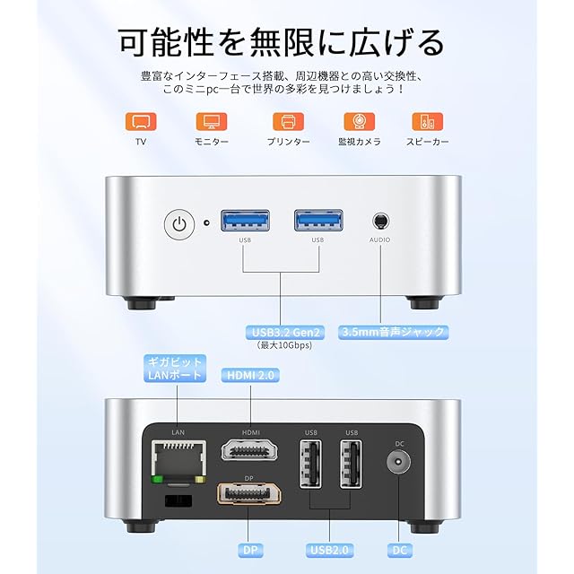 【多彩なインターフェース+臨場感あふれる4K出力】: 【ミニPCの実用性を高めるポート群】Intel N150搭載したミニPCは2つのUSB 3.2(Type-A)ポートを搭載しており、最大10Gbpsの高速データ転送が可能です。外付けHDDやその他の周辺機器とスムーズに接続でき、大容量データの転送やファイル操作がストレスフリーで行えます。画像出力ポート以外には USB2.0*2(Type-A)、1000Mbps有線LANポート*1、3.5mmの音声ジャック*1なども備え、多彩な周辺機器と接続が可能で多様なニーズに対応します。【4K@60Hz 2画面出力】この小型pcに搭載されたHDMI2.0とDP1.4端子各一つを通してサイズ自由の大画面モニターとの接続も可能で、作業中も多くの情報を見やすく表示できます。統合されたインテルUHD Graphicsより最大4096x2160@60Hzの高精細画質出力対応し、クリアで鮮明な映像やテキストを提供し、デザインや編集作業にも最適です。
