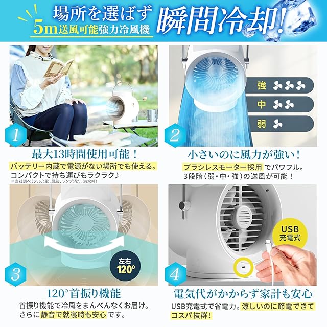 冷風機 強力冷風扇 【2025年製品・4000mAhバッテリー・USB給電式・アロマテラピー可】