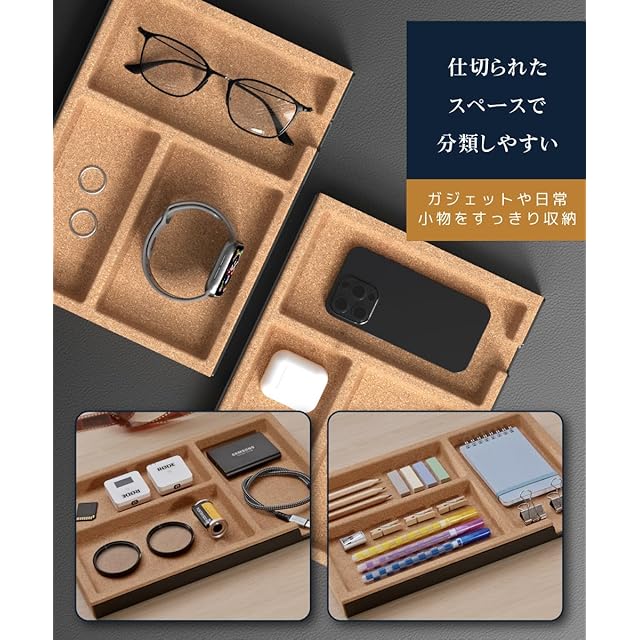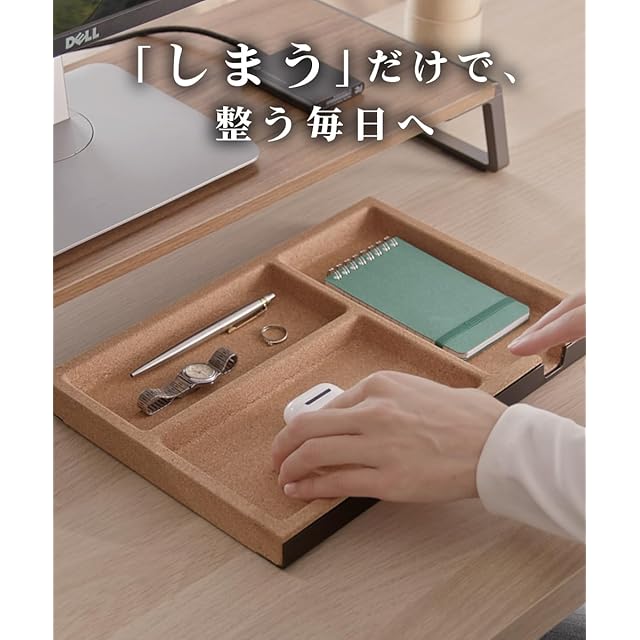 【 デスクライザー対応で快適な収納スペースを確保 】 デスクライザーやデスクスタンドの下にすっきり収まり、USB・SDカード・鍵・アクセサリーなどの小物を整理整頓。デスク上の散らかりを解消し、作業効率を向上させます。※カトラリーや日用品の収納にもご活用いただけます。ただし、コルク素材の特性上、水濡れや食品との直接接触にはご注意ください。