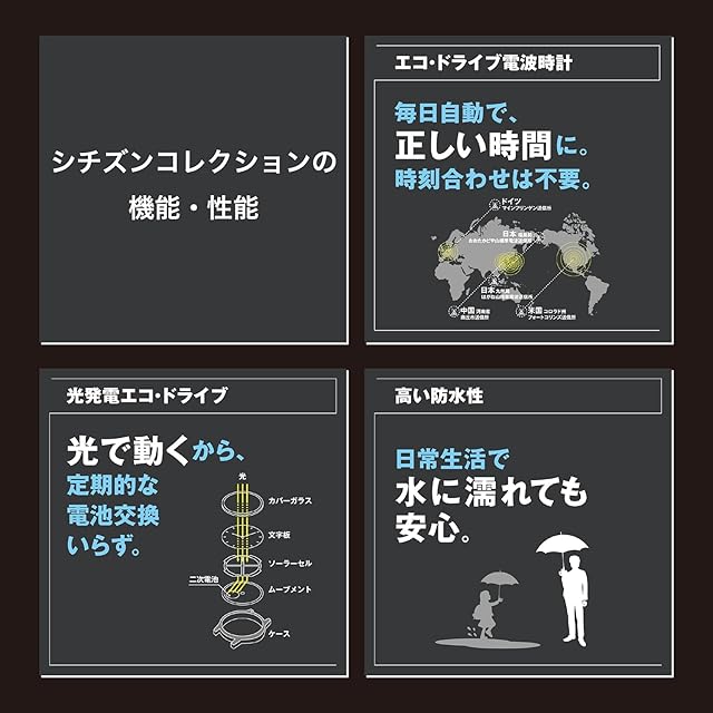 【頼れる機能・性能】定期的な電池交換不要のシチズン独自技術の光発電エコ・ドライブ搭載で手間いらず。どこにいても正確な時刻に同期するワールドタイム電波時計。水仕事にも安心な10気圧防水。便利な日付、夜光つき(針+インデックス)。※操作方法は、メーカーウェブサイトの取扱説明書から確認することもできます(機種番号:E660)。