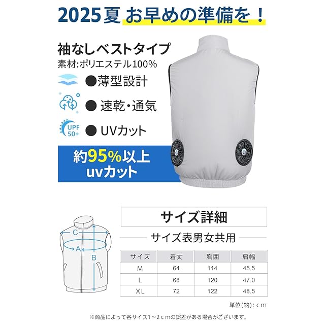 【 ファン付きベスト & 暑い時期も涼しく過ごせる】左右の腰の辺りに取り付け2基のファンにより、服内に外気を取り込み、身体から出る汗を効率よく気化させ、全身を涼しく保ってくれる冷却 ベストです。真夏のべたつく汗、焼けつくような日差し対策として活躍します。また、涼しい送風のほか、UVカット加工で日焼け対策にもパッチリ!夏用 に向いている冷却服です。