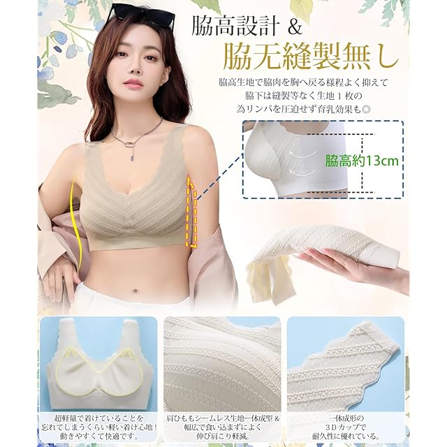 【肌を自由に呼吸させ・シームレスブラ】ブ素肌に優しい生地コットンを使用して、滑らかな質感、お肌にやさしく、肌を自由に呼吸させ。『無縫製』『ノンワイヤー』で肌に負担がかかるものを解消し、締め付け感のないストレスフリーな着け心地を実現しました。無痕の幅広く側翼で移動しないくらい安定。副乳を集中して、二の腕を細くする。美を内部から外へ発散して自信満々にする。