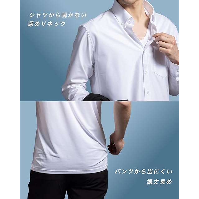 【気になるニオイを抑え、一日中フレッシュに】公的機関で認められた確かな抗菌防臭効果により、汗のニオイや加齢臭を効果的に抑えます。一日中、清潔で快適な着心地を実感できます。すべての男性におすすめしたいインナーシャツです。【ビジネスシーンに最適な設計】ワイシャツやポロシャツの下に着用しても、インナーシャツが見えないように襟ぐりを深めに設計。また、裾丈を長めにすることで、シャツの裾からインナーシャツがはみ出すのを防ぎます。