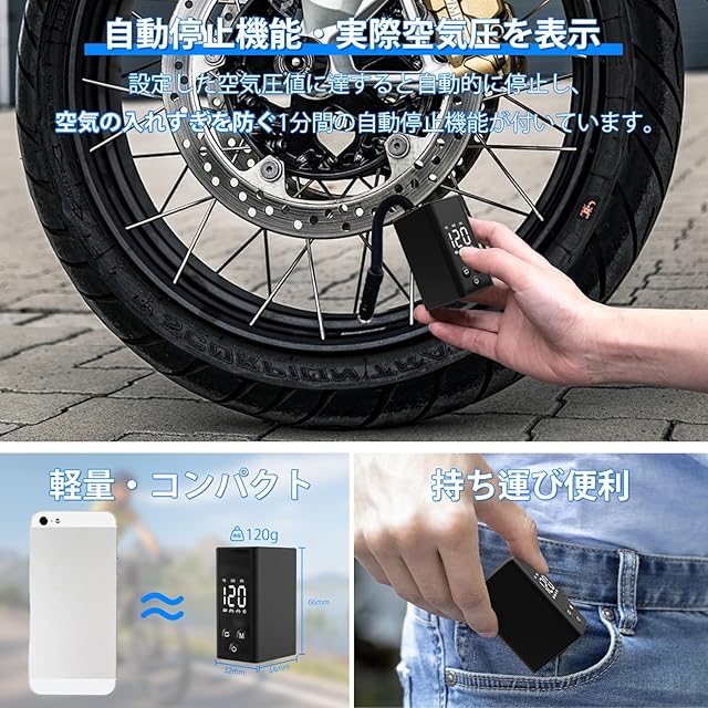 自転車 空気入れ【120PSI・自動停止・空気圧表示】電動ポンプ 120g 小型・最軽量携帯ポンプ 米式・仏式バルブ対応 4つモード 単位切替 ロードバイク クロスバイク マウンテンバイク タイヤ電動空気入れ コンパクト ミニ 自転車 オートバイ 浮き輪 ボール用 350mAh USB充電式エアーポンプ 23分で急速充電 7つのバルブ エアーホース/収納袋/シリコン保護カバー/日本語説明書付き