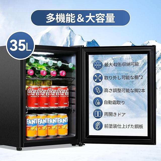 冷蔵庫 35L コンプレッサー式 1~15℃ ドリンク用 直冷式 幅40㎝ 自動霜取り 左右開き 庫内灯付き コンパクト 省エネ おしゃれ 一人暮らし 小型 サブ冷蔵庫 ガラスドア 保冷庫 静音 家庭用 寝室 ゲーミング バー 寮 ホテル カラオケ レストラン カフェ 黒枠